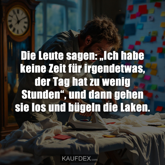 Die Leute sagen: „Ich habe keine Zeit für irgendetwas…KaufdexLustige - Zitate, Sprüche Die Leute sagen: „Ich habe keine Zeit für irgendetwas, der Tag hat zu wenig Stunden“, und dann gehen sie los und bügeln die Laken. An wen denkst du dabei? Jetzt teilen!teilen teilen teilen merken teilen