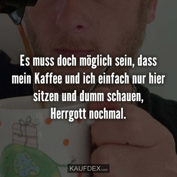 Es muss doch möglich sein, dass mein Kaffee und ich einfach nur hier sitzen und dumm schauen, Herrgott nochmal. teilen teilen teilen teilen merken Schlagwörter# Büro Sprüche# Kaffee Sprüche# Lustige Sprüche Vorheriger Beitrag Die Kinder haben draußen einen Flummi geworfen... Nächster Beitrag Alles steigt aber der Lohn bleibt konstant