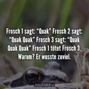 Frosch 1 sagt: „Quak“ Frosch 2 sagt: „Quak Quak“ Frosch 3 sagt: „Quak Quak Quak“ Frosch 1 tötet Frosch 3. Warum? Er wusste zuviel.