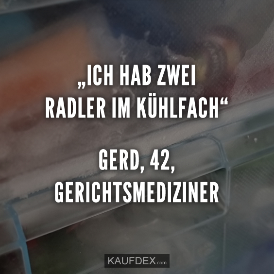 „Ich hab zwei Radler im Kühlfach“ Gerd, 42, Gerichtsmediziner teilen teilen teilen teilen merken Schlagwörter# Lustige Sprüche Vorheriger Beitrag In der Kindergarten WhatsApp-Gruppe wird vor einem... Nächster Beitrag Ich brauche morgens Kaffee, damit ich ungefährlich werde.