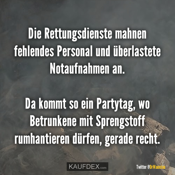 Die Rettungsdienste mahnen fehlendes Personal und überlastete Notaufnahmen an. Da kommt so ein Partytag, wo Betrunkene mit Sprengstoff rumhantieren dürfen, gerade recht.