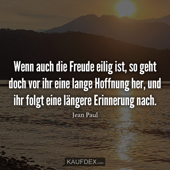 Wenn auch die Freude eilig ist, so geht doch vor ihr eine lange Hoffnung her, und ihr folgt eine längere Erinnerung nach. teilen teilen teilen teilen merken Schlagwörter# Jean Paul# Lebens Sprüche Vorheriger Beitrag Eine Tochter ist ein kleines Mädchen, die dafür aufwächst deine... Nächster Beitrag Bereue niemals einen Menschen kennengelernt zu haben...